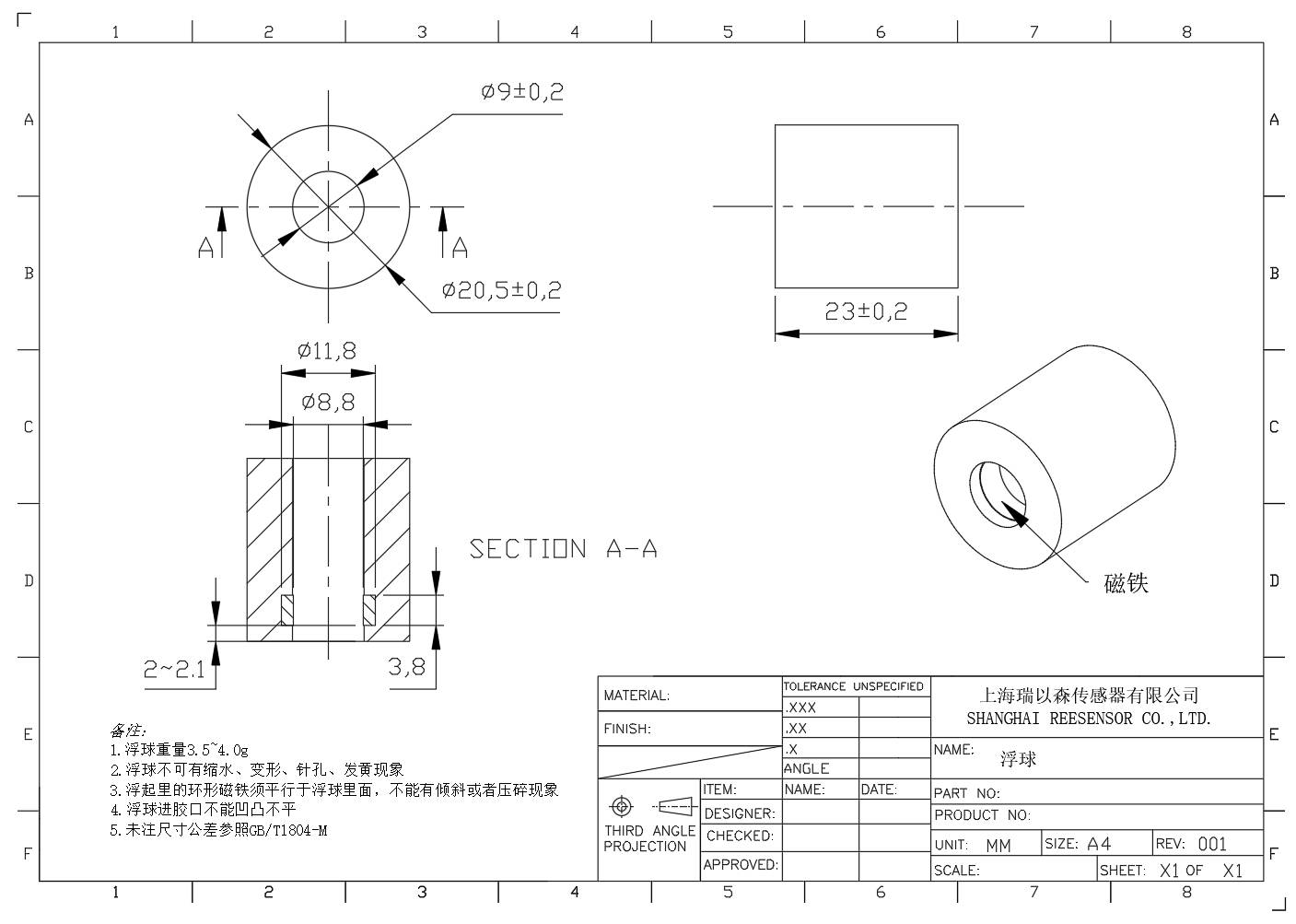 液位浮球,PP材质,较常见材质,吸水率极低,无毒无害,具有高的挠曲强度,相对光滑的表面。防潮,吸水率低,各种酸和碱中均具有良好的耐化学腐蚀性,适用于食品级及更高使用级别的环境,且价格相对低廉。