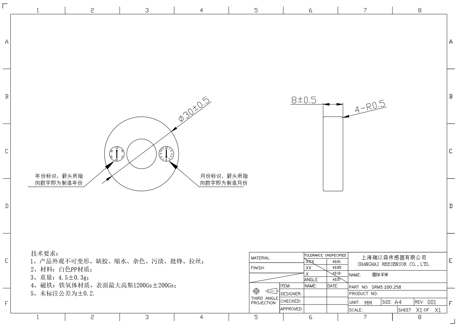 液位浮球,PP材质,较常见材质,吸水率极低,无毒无害,具有高的挠曲强度,相对光滑的表面。防潮,吸水率低,各种酸和碱中均具有良好的耐化学腐蚀性,适用于食品级及更高使用级别的环境,且价格相对低廉。